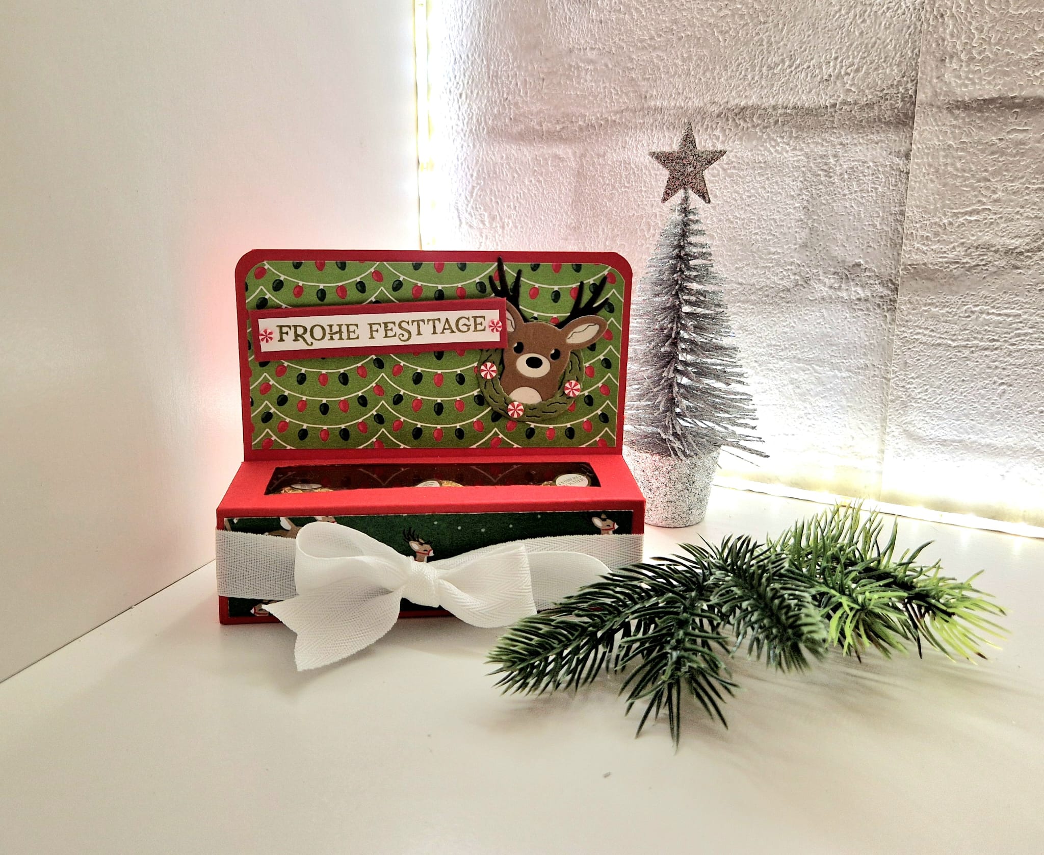 Farbkarton in Glutrot, Grundweiss, Klarsichtfolie, Designerpapier Rentierspiele, Schleifenband in weiß